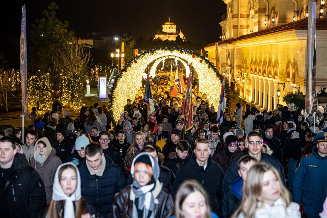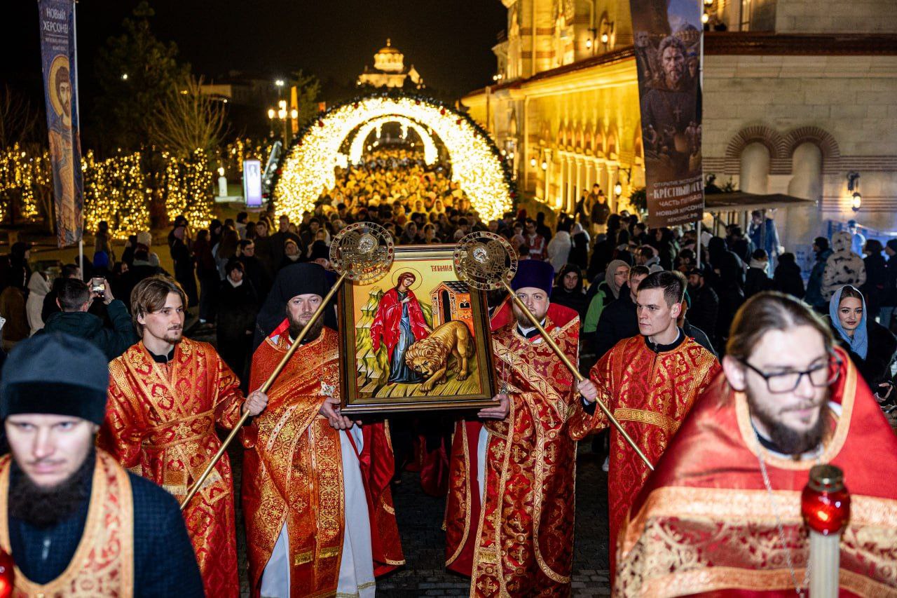 🔸По окончании ночного богослужения от Свято-Владимирского собора все молящиеся прошли крестным ходом по территории «Нового Херсонеса» до храма-парка под открытым небом — храма в честь Живоначальной Троицы. Здесь, под куполом звёздного неба, глава Крымской митрополии поздравил учащих и учащихся благословенной земли Тавриды с Татианиным днём и преподал всем архипастырское благословение.