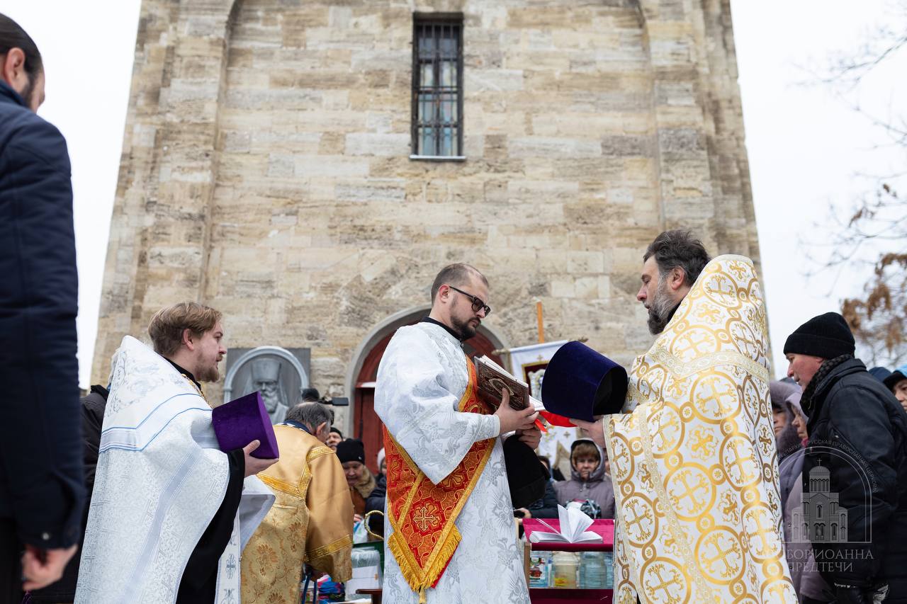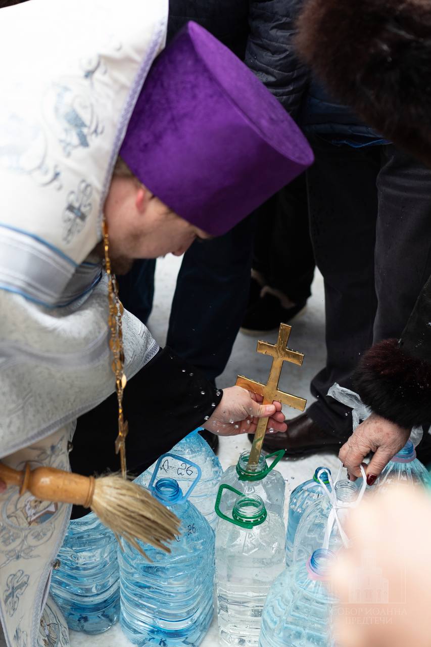 По заамвонной молитве отец Андрей совершил чин Великого освящения воды и окропил ей всех молящихся.