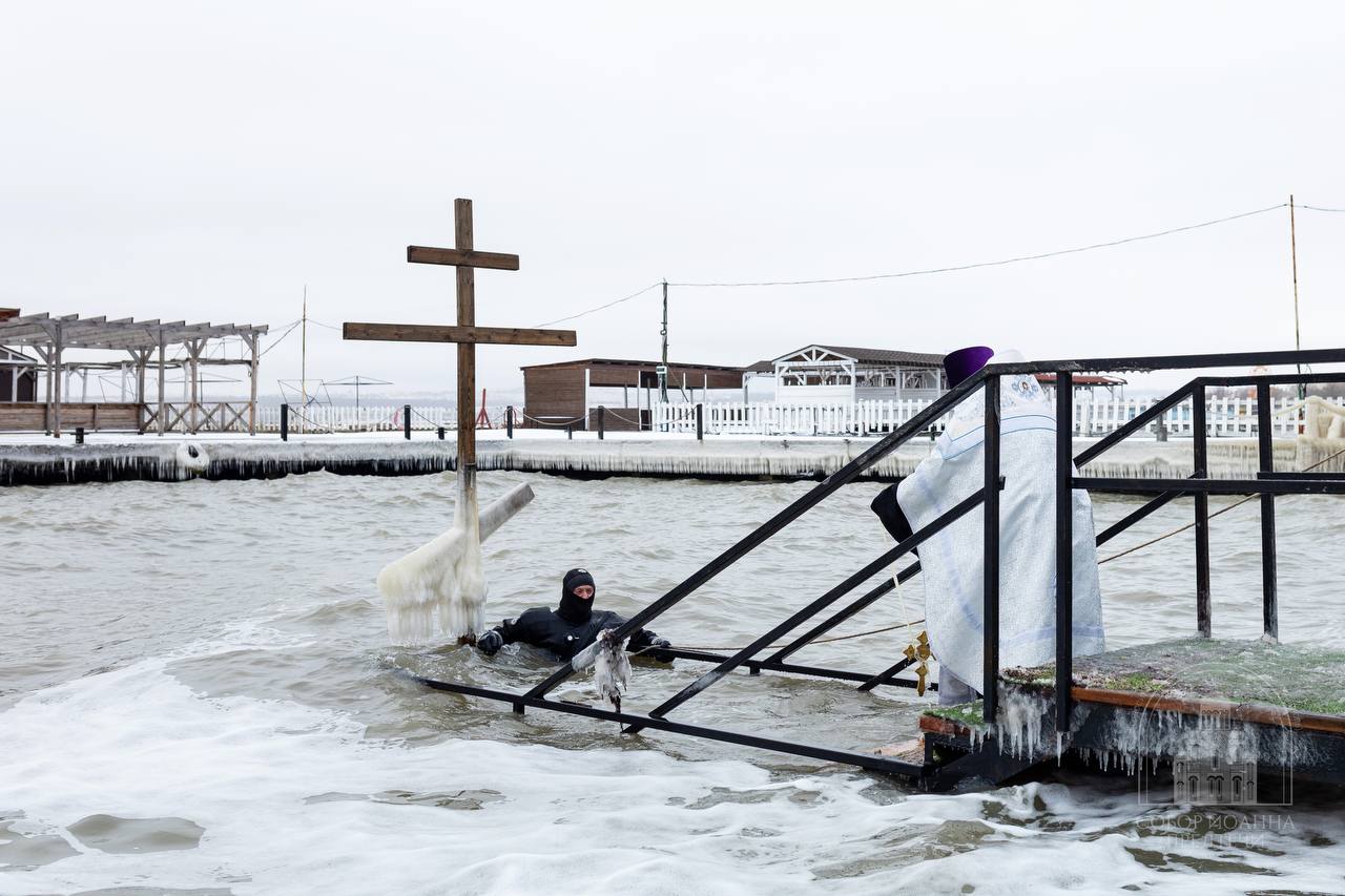 По окончании богослужения духовенство и прихожане прошли крестным ходом к центральной набережной, где иерей Андрей совершил троекратное погружение креста в море.